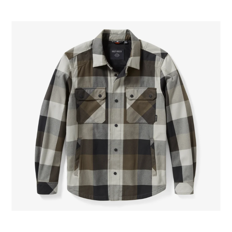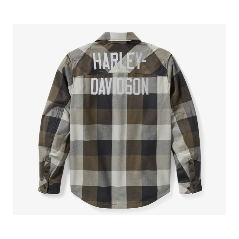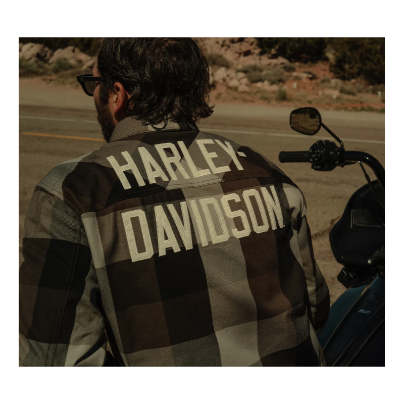 Notre sur-chemise de moto H-D® Operative 2.0 est un must-have à mettre sur votre liste de cadeaux. Son mélange sergé épais est partiellement doublé pour offrir un confort similaire à celui d'une chemise plutôt que d'un blouson. Elle est dotée d'un matériau réfléchissant pour améliorer la visibilité, d'un col à boutons-pression dissimulés qui ne flottera pas au vent lorsque vous roulez, et offre une protection supérieure contre les chocs grâce à nos protections D3O® Ghost™ au niveau des épaules et des coudes. Cette chemise moto pour homme est également testée et certifiée pour répondre aux exigences en matière d'abrasion, de déchirure et de résistance des coutures (plus de détails ci-dessous). Son beau motif à carreaux est discret sur le devant, tandis que des motifs brodés remplissent le dos. Rappel historique : le style de lettrage à l’arrière imite celui de nos maillots de course des années 1920. Consultez les caractéristiques ci-dessous, puis commandez le vôtre dès que possible.