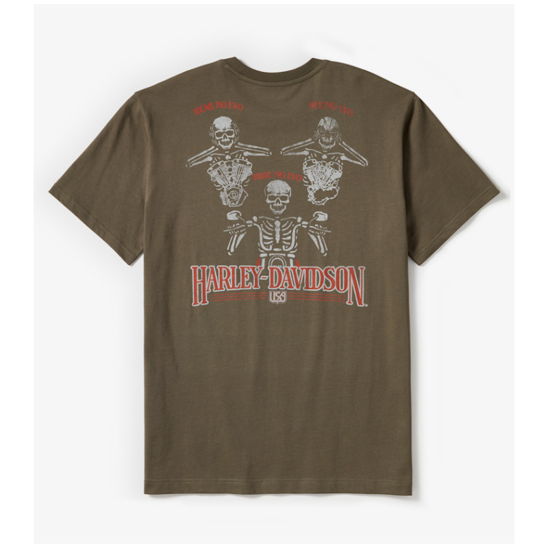 Le style nostalgique s'exprime sur notre T-shirt graphique See No EVO. Fabriqué en jersey de coton respirant pour offrir un confort optimal, ce T-shirt pour hommes est doté d’une encolure en tricot côtelé pour aider à conserver sa forme. Le motif sur le devant imite la décoration de nos réservoirs des années 1980. L’illustration personnalisée à l’arrière combine la décoration des réservoirs des années 1980 avec des designs inspirés de l’héritage de notre moteur Evolution® ou « Evo » (1984 à 1999).