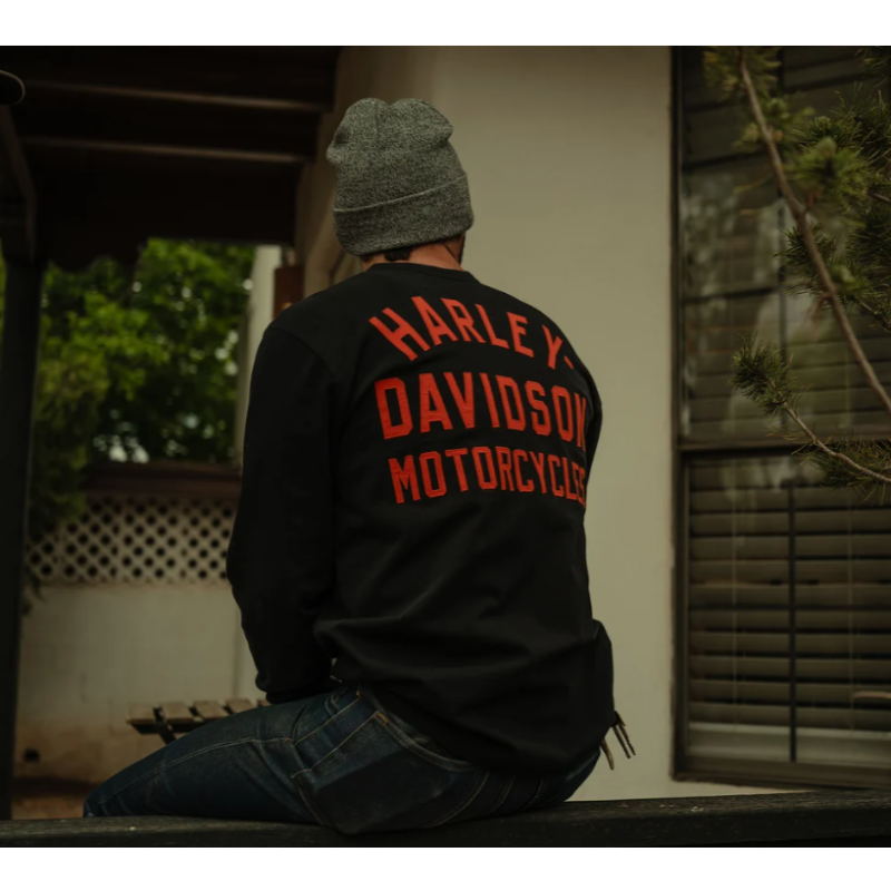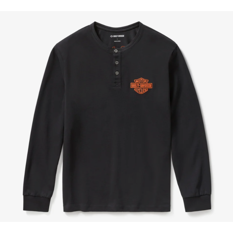 Ce modèle décontracté rend hommage à notre héritage en Flat Track. Fabriqué à partir de jersey de coton épais, notre Henley Racer Font est délavé pour offrir plus de douceur et un look bien usé. Ce Henley à manches longues pour hommes est doté d’une patte de boutonnage à trois boutons et de poignets en tricot côtelé pour aider à conserver sa forme. Il arbore une touche brodée de notre Bar & Shield sur le devant et un motif cousu à l’arrière qui ressemble aux maillots de course issus de nos archives.