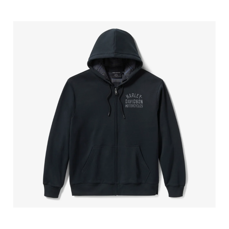 Le style Harley s'exprime sur notre sweat à capuche zippé doublé à carreaux. Il intègre une capuche doublée qui dévoile deux ouvertures pour rentrer le cordon de serrage afin qu’il ne batte pas sous votre équipement de moto. Ce sweat à capuche pour hommes en molleton de coton/polyester dispose également d’une poche de rangement intérieure et d’une doublure en sergé brossé à carreaux. Le devant arbore des motifs brodés qui ressemblent à ceux des maillots de compétition issus de nos archives, tandis qu’un écusson de notre marque la plus emblématique exprime dans le dos.