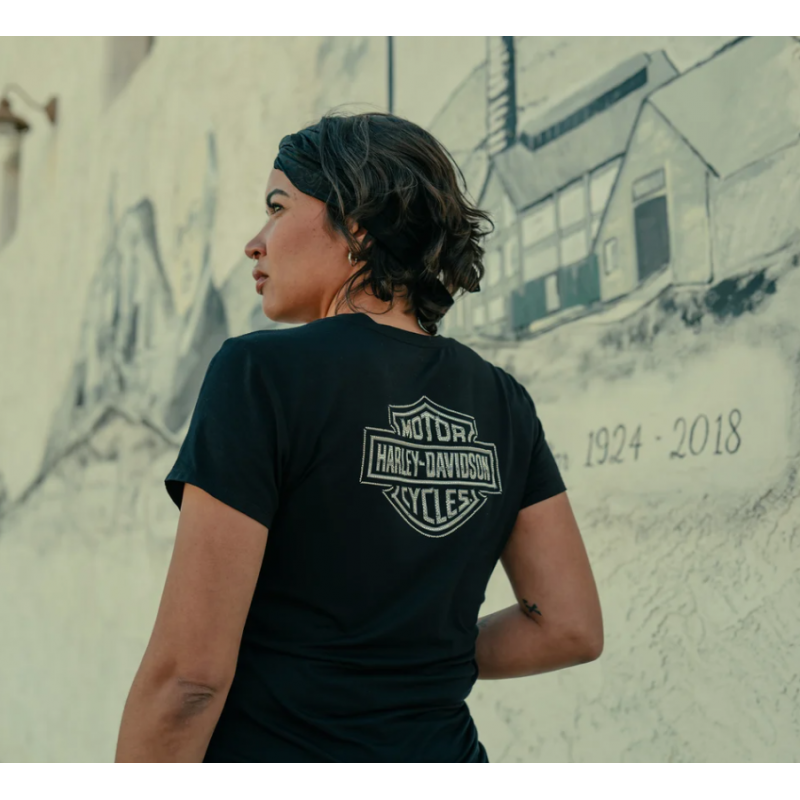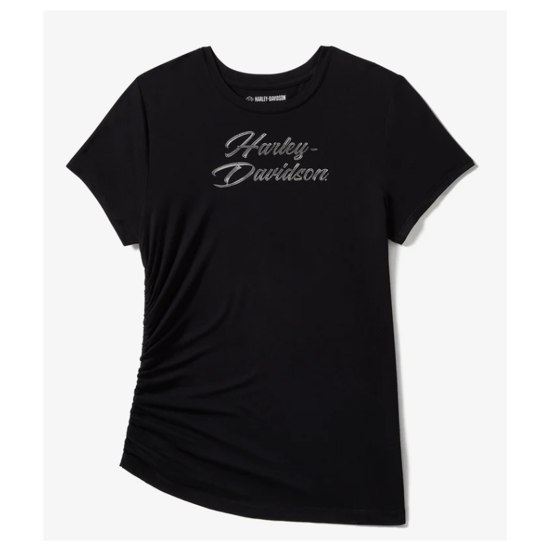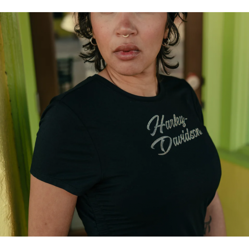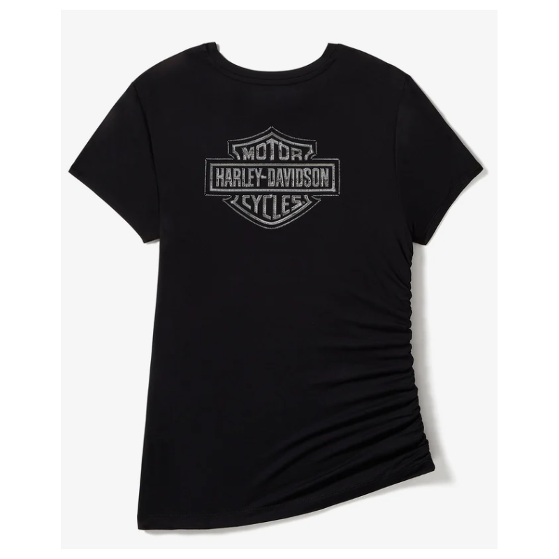 Ajoutez un peu d’éclat à votre style de passionné de la moto avec notre haut à manches courtes Essential Bling. Conçu pour offrir un confort durable à partir d’un jersey de rayonne super doux avec une touche d’élasthanne pour plus d’élasticité. Ce haut pour femmes intègre des caractéristiques flatteuses comme une encolure dégagée et un ourlet asymétrique avec des fronces. Magnifiquement fini avec des motifs H-D embellis des deux côtés pour offrir un look glamour et intemporel.