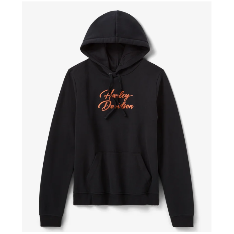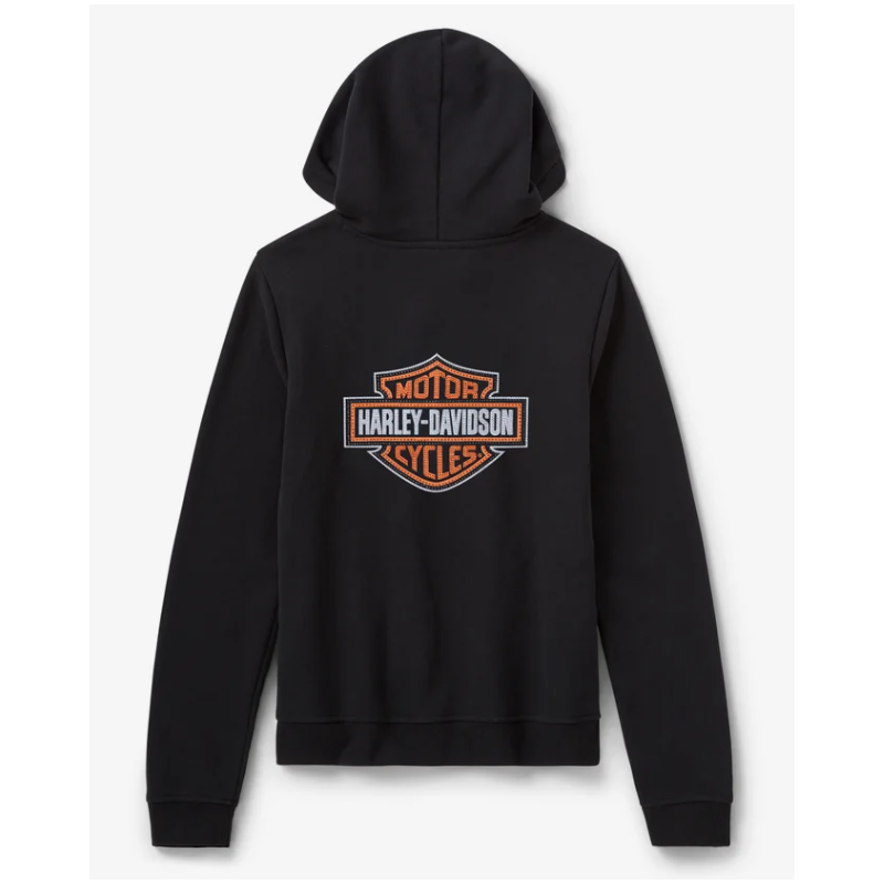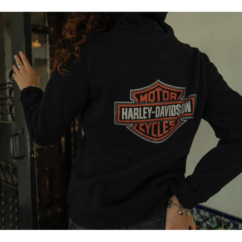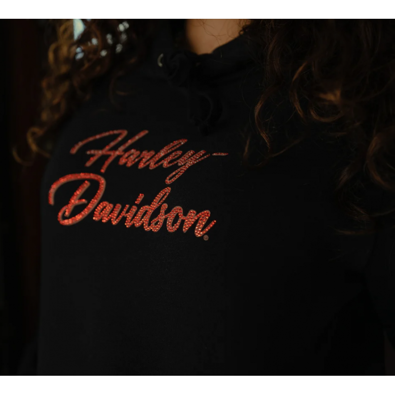 Ajoutez une touche d'éclat à votre look Harley classique avec notre Sweat à capuche pullover Essential Bling. Il est confectionné en polaire coton/polyester pour vous garder au chaud, et sa coupe décontractée vous garantit un confort optimal. Ce sweat à capuche pour femme est audacieusement orné d'un graphisme en strass sur les deux côtés.